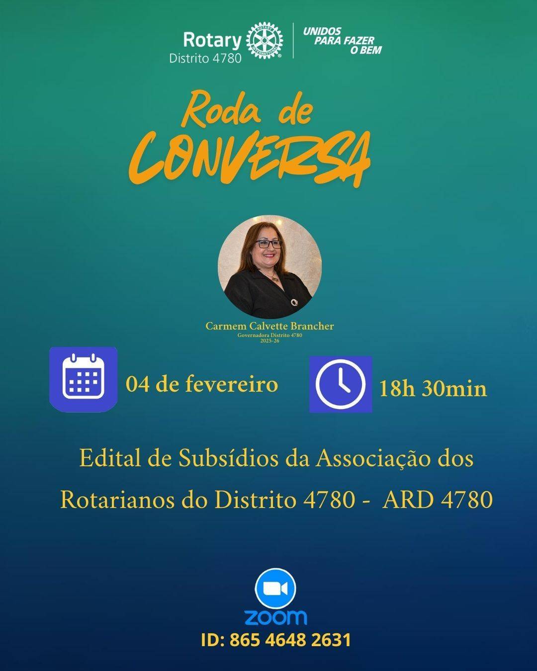 O encontro terá como pauta o Edital de Subsídios da Associação dos Rotarianos do Distrito 4780 – ARD 4780, trazendo orientações e esclarecimentos para que os clubes possam aproveitar essa oportunidade da melhor forma.